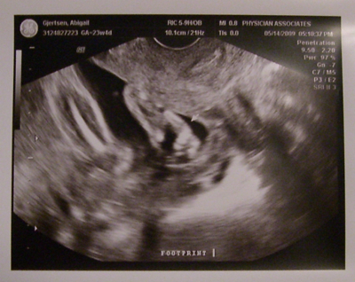 Fortunately he was kicking mightily through the whole thing, so at least that told me he was alive! After discussion with John and a few phone calls to medical people, it was determined that I should rest, drink water, and wait to see if the bleeding continued before going to the hospital. And that, praise God, is where it ended. I never had any more blood, and after some appointments this week, everything checked out normal. Number three was dancing on my bladder during Thursday’s ultrasound, so I got some good views of his jigging feet, legs, and “boy parts,” but unfortunately nothing above his hips. Can you see his foot next to the arrow below?