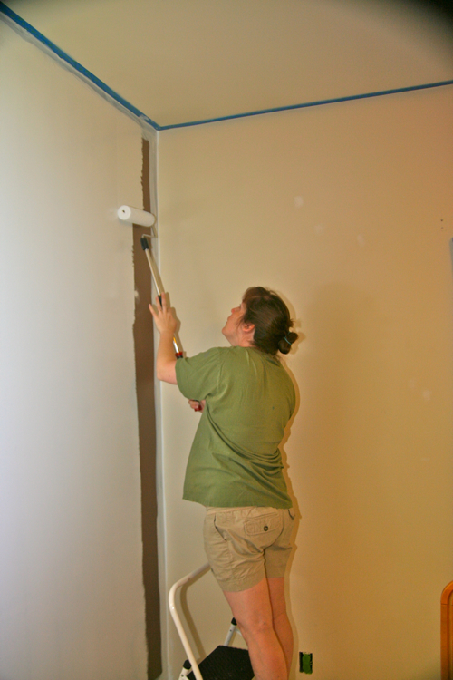 But when we moved into this house, the room was a light cream color except one accent wall was like really dark brown chocolate. It was okay for Valor’s last few months of being in a crib, but not what we envisioned for the next baby. Here is Abby covering up the chocolate wall with some KILZ: